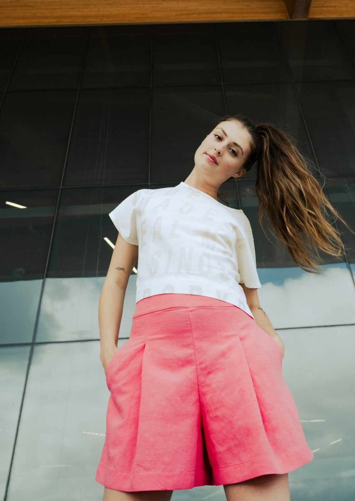 High waist with front pleats. Invisible side zip. Side pockets and one piped back pocket. Mid-thigh length enhances proportion and silhouette.