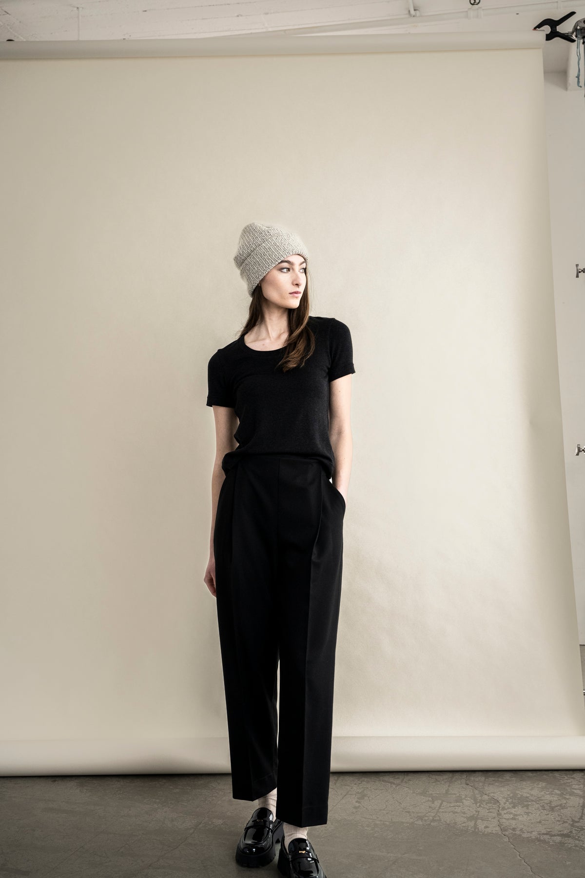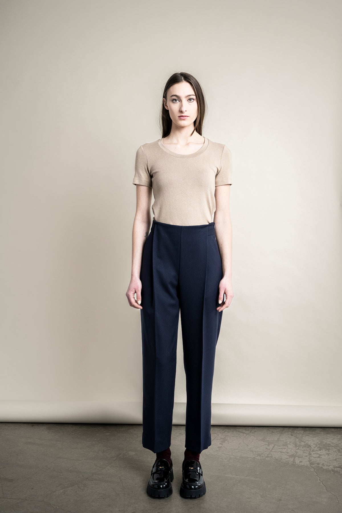 Cut with a tapered leg and pleated front, the fit is clean and flattering, finished with side pockets, a single back pocket, and a discreet invisible side zipper.