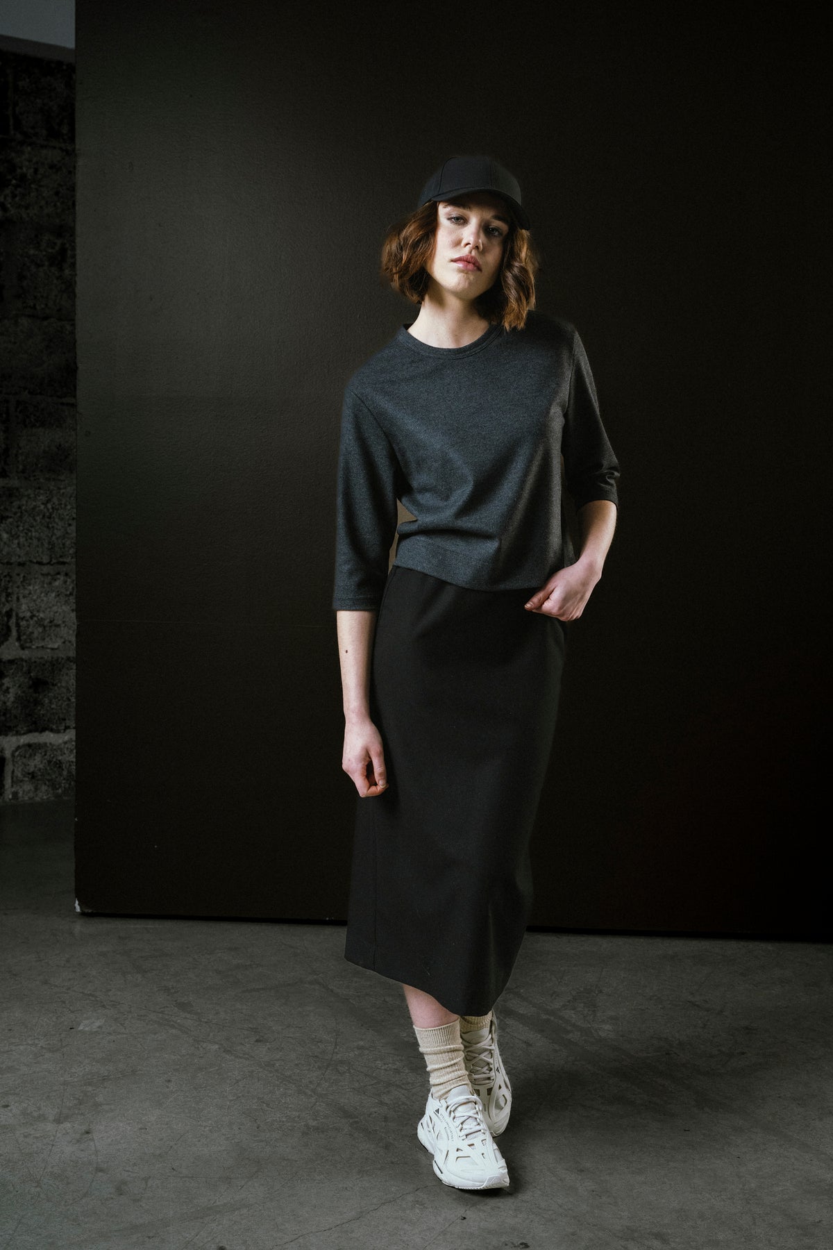 Le mannequin Léa mesure 1,75 m et porte une taille Small. Coupé, cousu et entièrement fabriqué à Montréal, Canada.