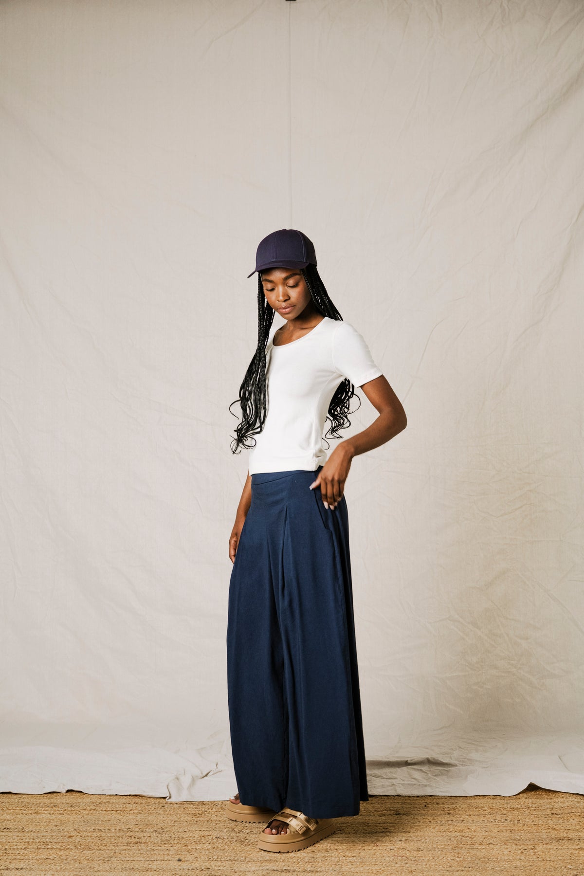 Pantalon évasé taille haute à la ligne épurée et allongée.