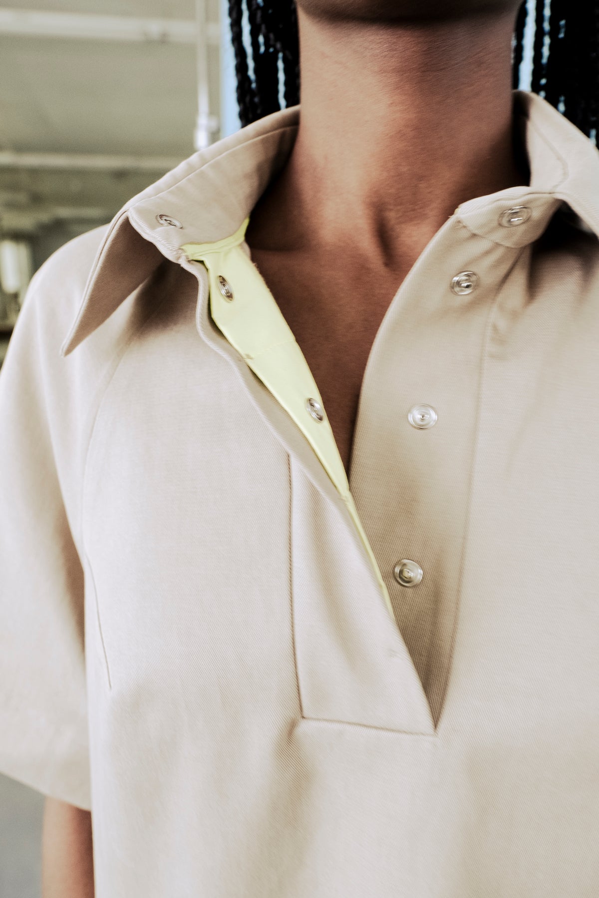 Confectionné dans un mélange de Tencel et de coton, le tissu est doux, respirant et légèrement structuré. Son toucher est lisse et son poids subtil, ce qui permet à la silhouette de conserver sa forme tout en restant confortable.
