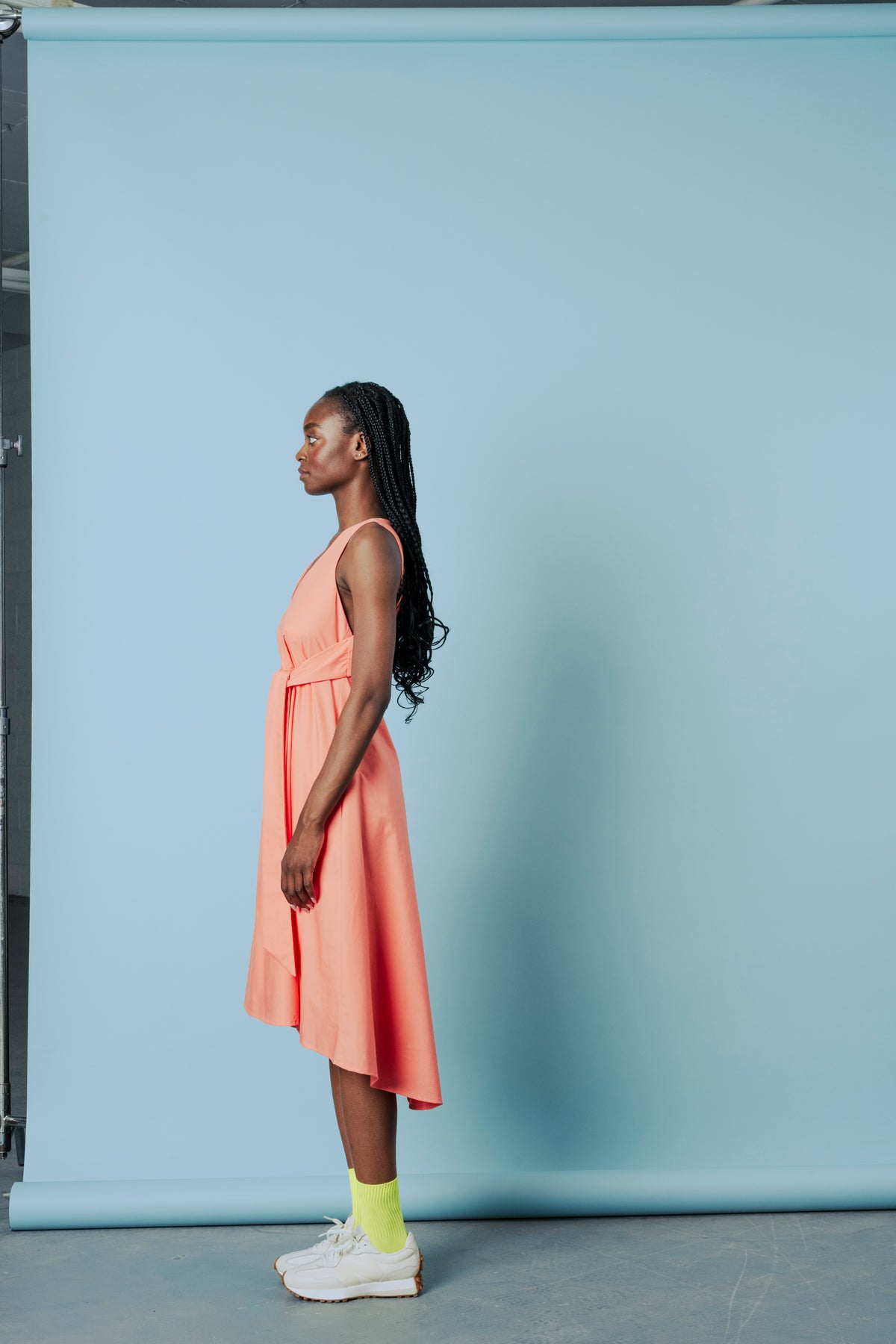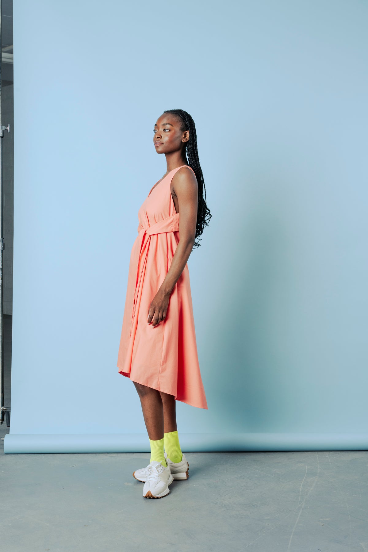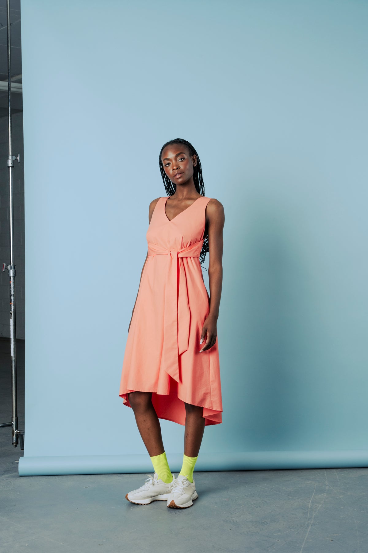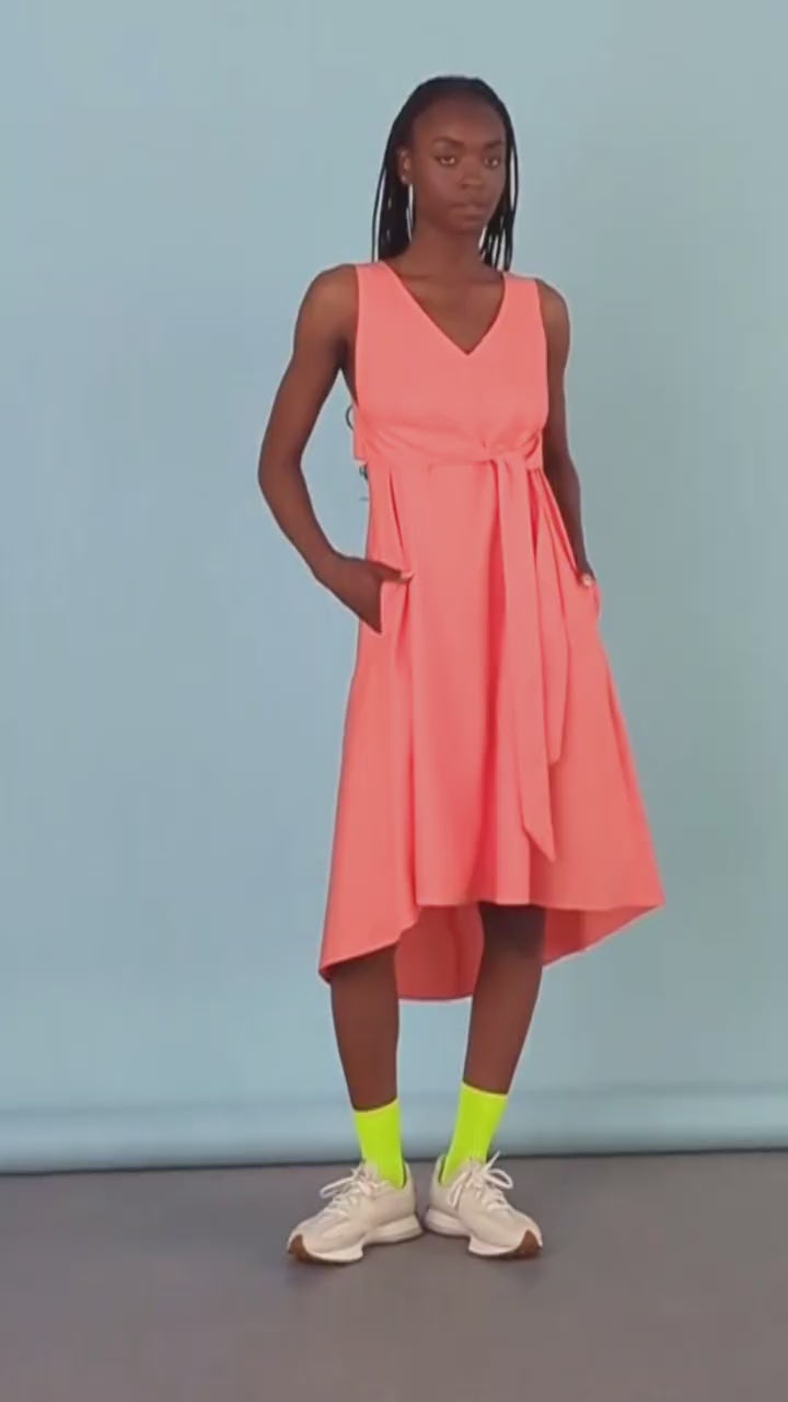 La silhouette est cintrée à la taille par une ceinture intégrée, créant une forme subtile. Un décolleté en V met en valeur le devant, tandis qu'une discrète ouverture dans le bas du dos apporte une touche de raffinement. Des poches latérales offrent une praticité discrète. La robe se ferme naturellement, sans fermeture éclair, et son ourlet arrière est légèrement plus long.