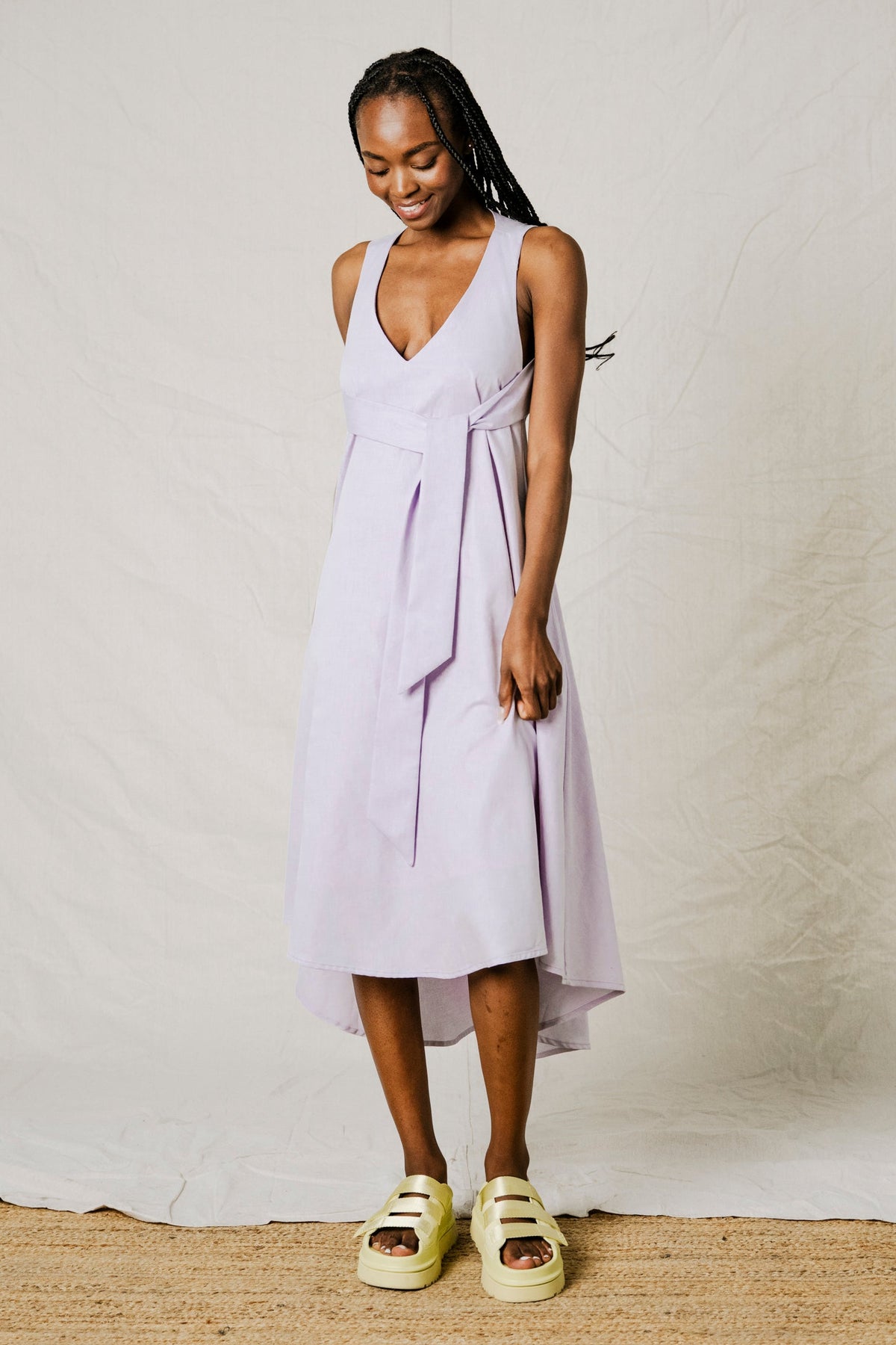 La silhouette est cintrée à la taille par une ceinture intégrée, créant une forme subtile. Un décolleté en V met en valeur le devant, tandis qu'une discrète ouverture dans le bas du dos apporte une touche de raffinement. Des poches latérales offrent une praticité discrète. La robe se ferme naturellement, sans fermeture éclair, et son ourlet arrière est légèrement plus long.