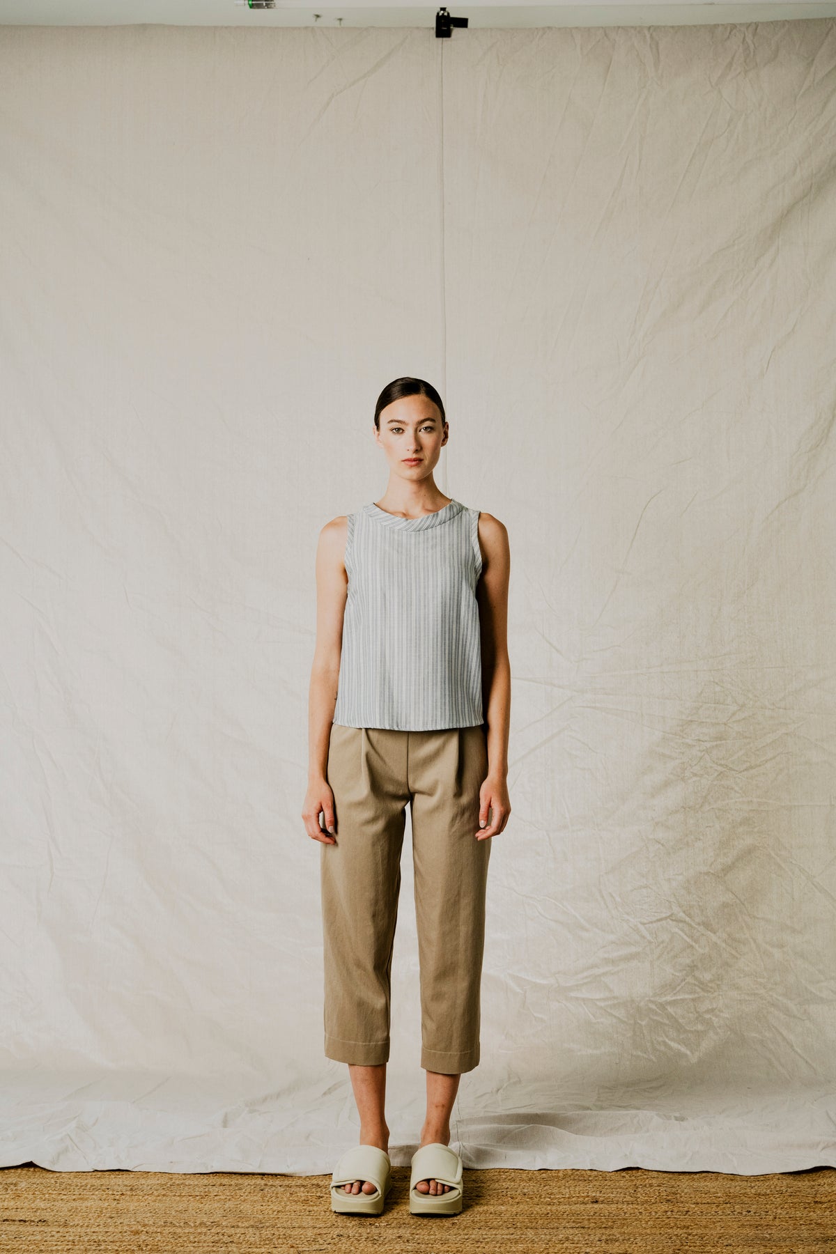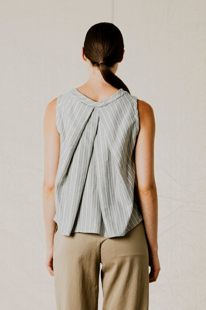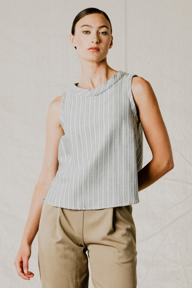 Un top carré sans manches, défini par le volume et la fluidité du mouvement.