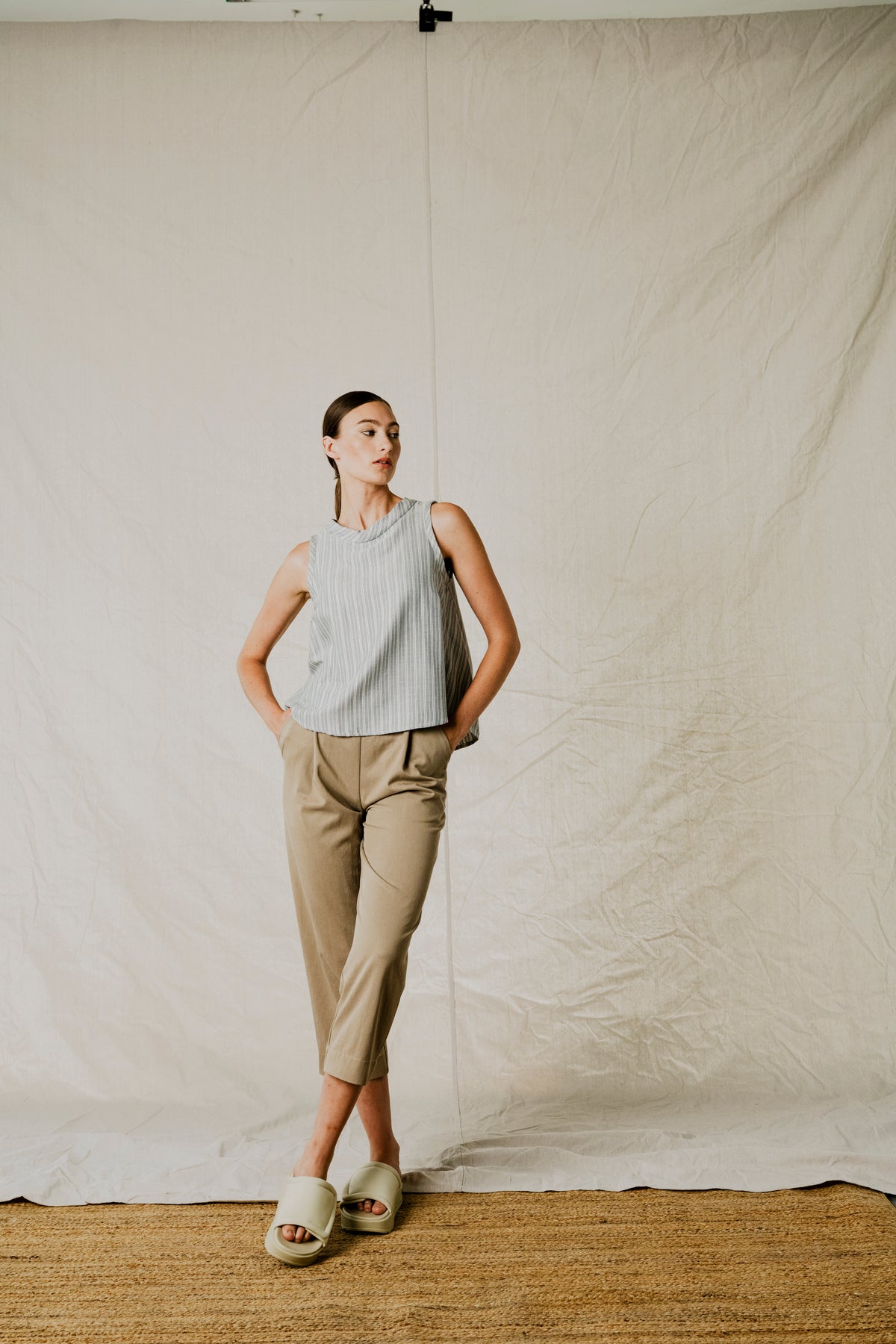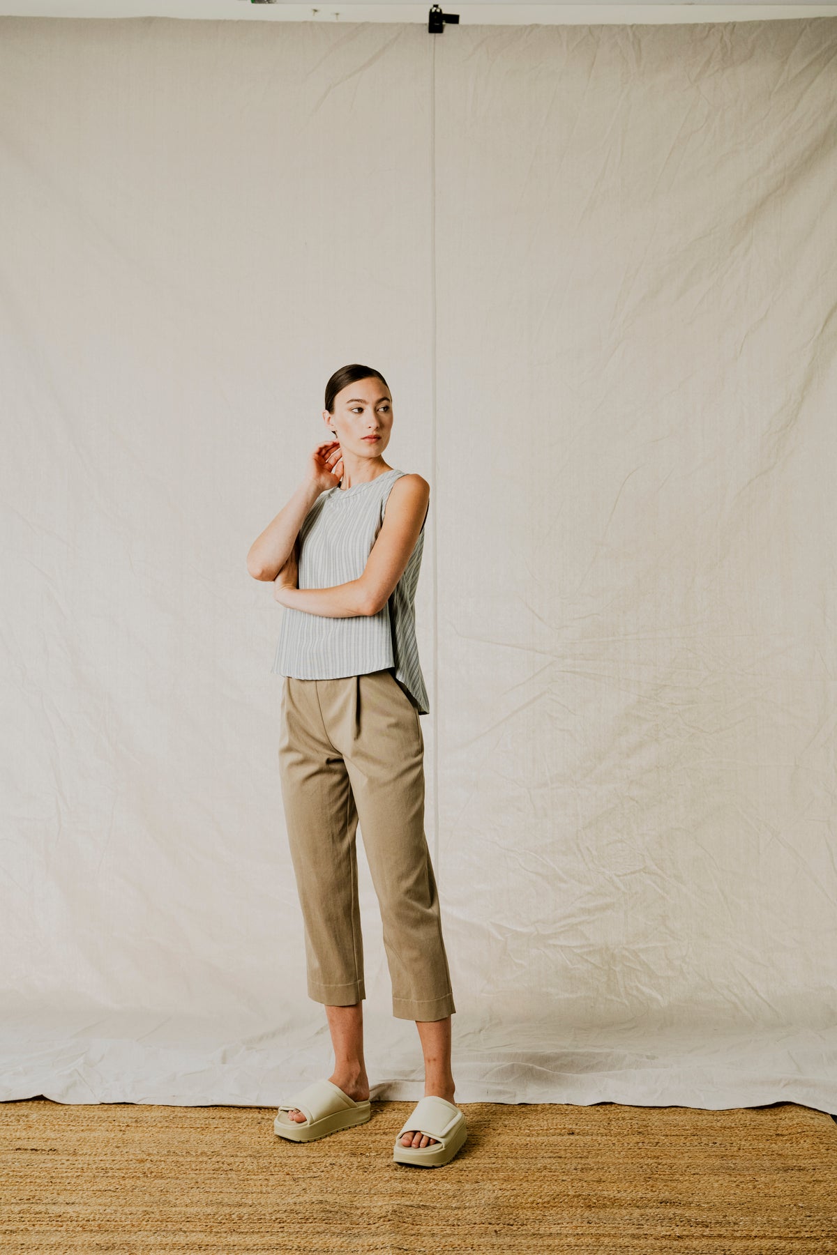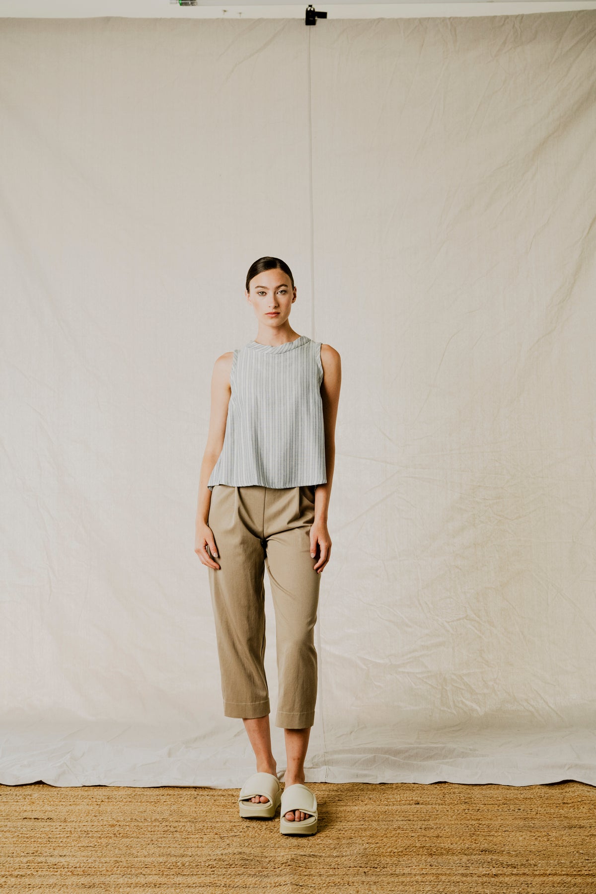 Un top carré sans manches, défini par le volume et la fluidité du mouvement.