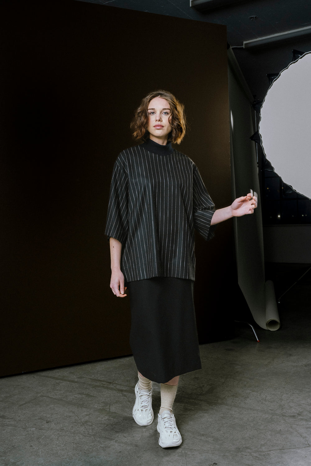Fabriqué à partir d'un tissu doux à rayures fines avec un col montant en tricot côtelé, il offre une élasticité douce et une texture lisse qui se drape sans effort.