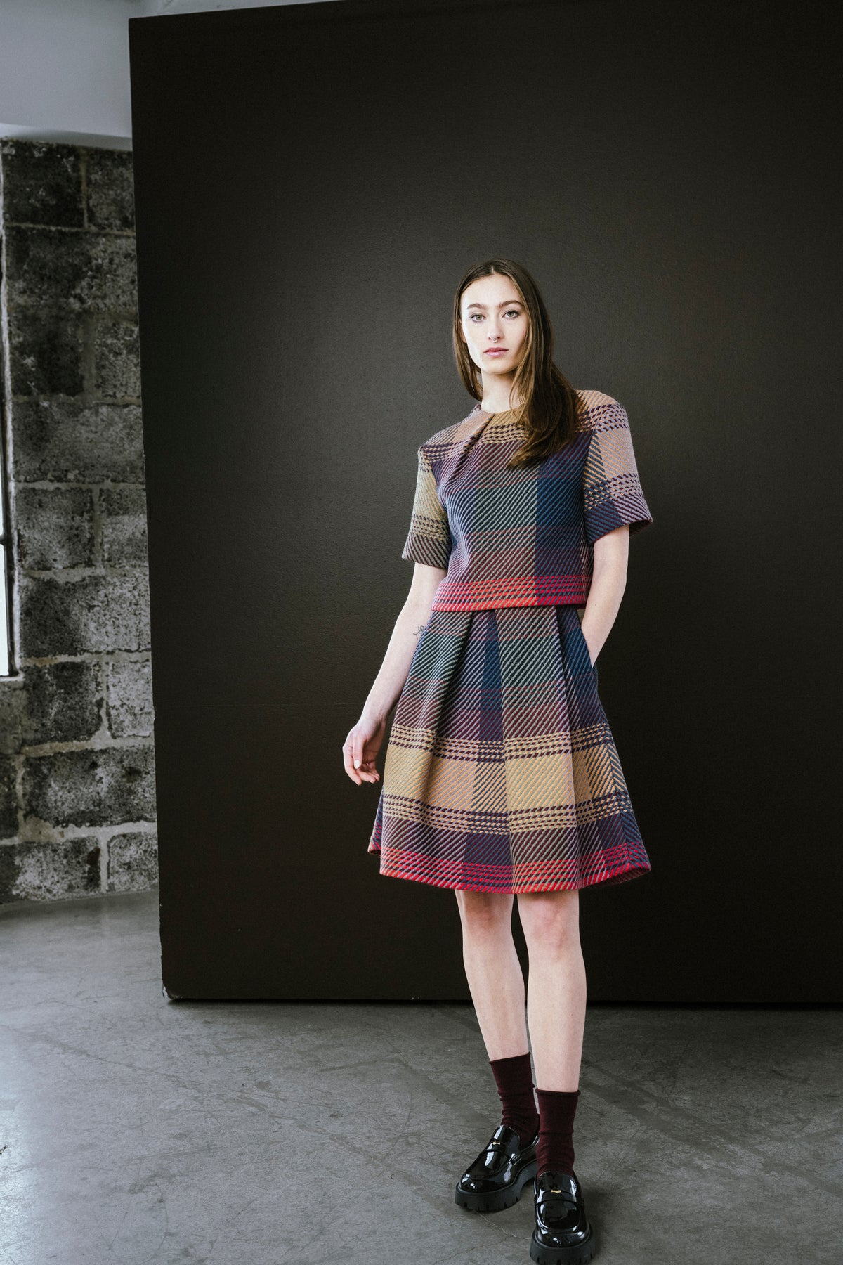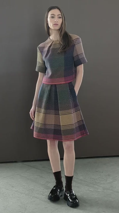 Haut court à carreaux. Confectionné dans un tissu écossais exclusif Bodybag, importé de France. Veuillez noter que chaque pièce est unique en raison des variations naturelles du tissu écossais.